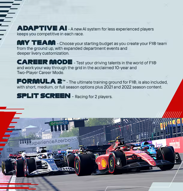 借助由全部车手、车队及赛车涂装组成的真实阵容,使用 Formula 1® 及 Formula 2™ 2022 赛季的惊人赛车比赛。通过全新沉浸式与广播式比赛序列来掌控自己的比赛体验。在备受赞誉的“我的车队”生涯模式中,创建一支车队,带领他们脱颖而出,在分屏、双人生涯或多人模式中展开正面交锋,或者通过我们全新的倍耐力最快单圈功能,从这项运动的巨星处获得超级赛车来改变速度。